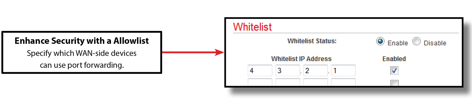 Note that any WAN-side device can use port forwarding, but you can greatly enhance security by creating a Allowlist of allowed WAN-side devices.