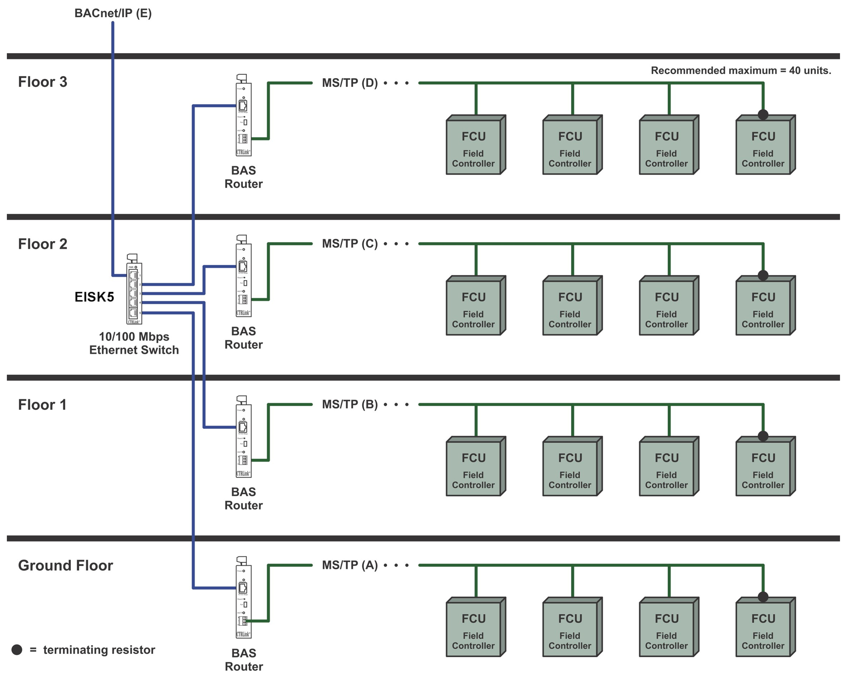 The following example utilizes a dedicated BASrouter on each floor that connects all the control units. This approach eliminates the need for inter-floor EIA-485 wiring, reduces traffic on each MS/TP segment, and simplifies troubleshooting.