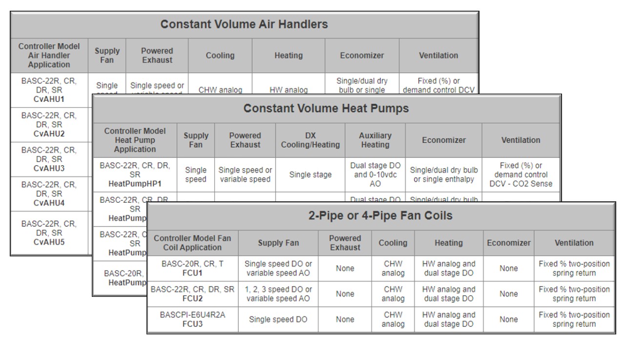 Although all controller models are freely programmable using Sedona, they can be made into configurable controllers by installing one of the pre-built applications: